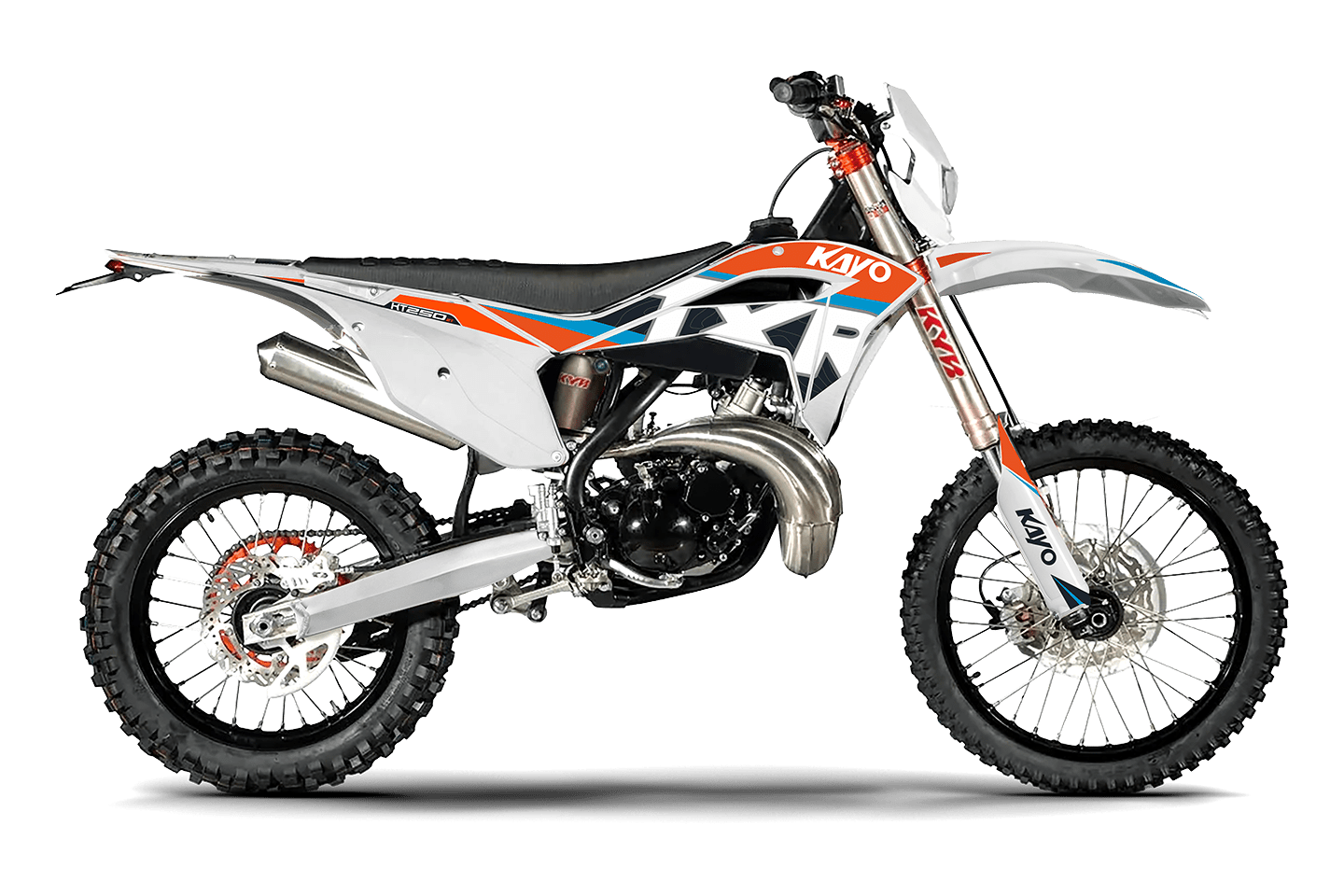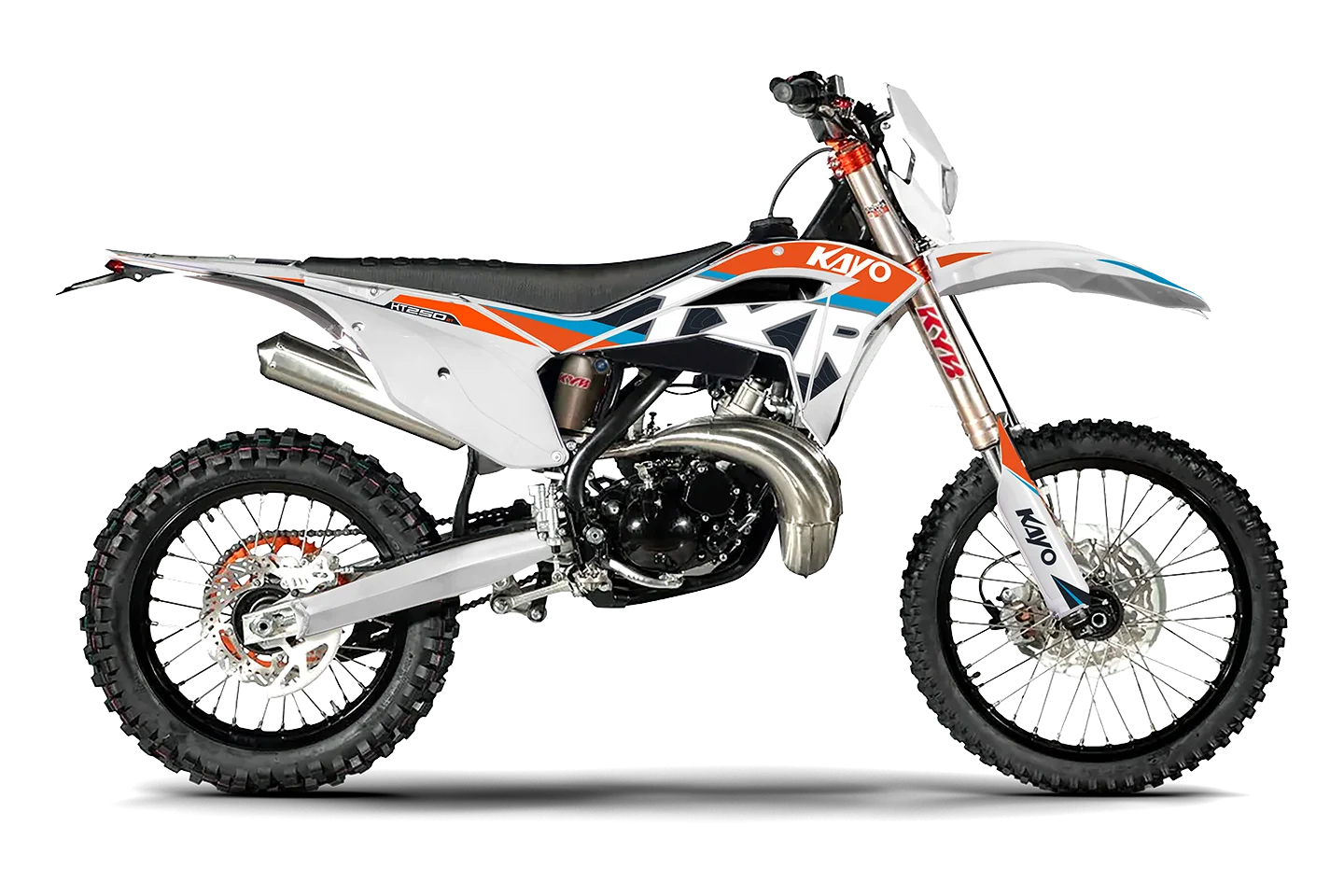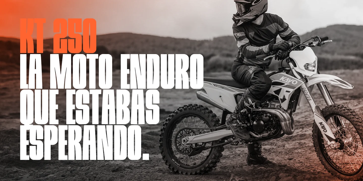 La KAYO KT250 2T combina una arquitectura orientada al rendimiento con componentes pensados para la exigencia del off-road. Equipada con motor de 250 cc, caja de 6 velocidades, arranque eléctrico y a patada, suspensión KYB regulable adelante y atrás y frenos BrakeTec de disco hidráulico de 240 mm, ofrece una respuesta precisa y un gran nivel de control. Su equipamiento se completa con cuadro de acero al cromo, llantas de aluminio, escape de aluminio, manubrio de diámetro variable, palancas rebatibles, componentes CNC y neumáticos Kenda, logrando un conjunto técnico, liviano y preparado para una conducción deportiva.